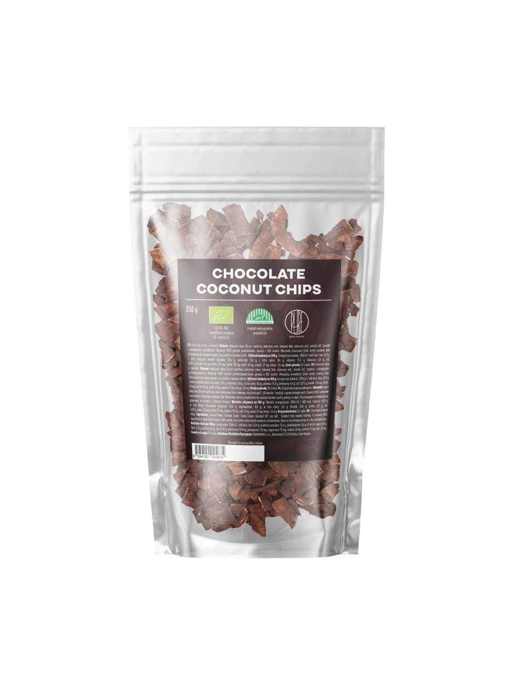 - 50 % BIO kokosových chipsů a 50 % BIO hořké čokolády